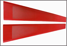 3、适用范围广,专业适用性更强,适用任何型号的振动筛机并可量机制作。聚氨酯筛板专业应用于水电站、建材及其它金属选矿业。0.1mm—170mm范围内各种物料的筛分,无论干筛、湿筛都毫不影响筛分效率。对0.5m—3mm范围内的脱水、脱介筛、更加充分地显示了聚氨酯筛面的优越性。产品耐水、耐腐蚀、耐老化,更换维护方便。聚氨酯密度小( 1.32kg/ m 3 ),重量轻于金属筛面,能降低生产单耗,因此能适应筛机大型化发展要求。